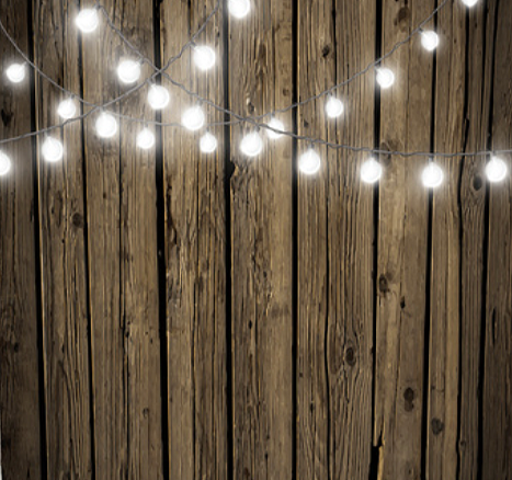 Featuring beautifully textured wood plank styling accented with soft string lights.